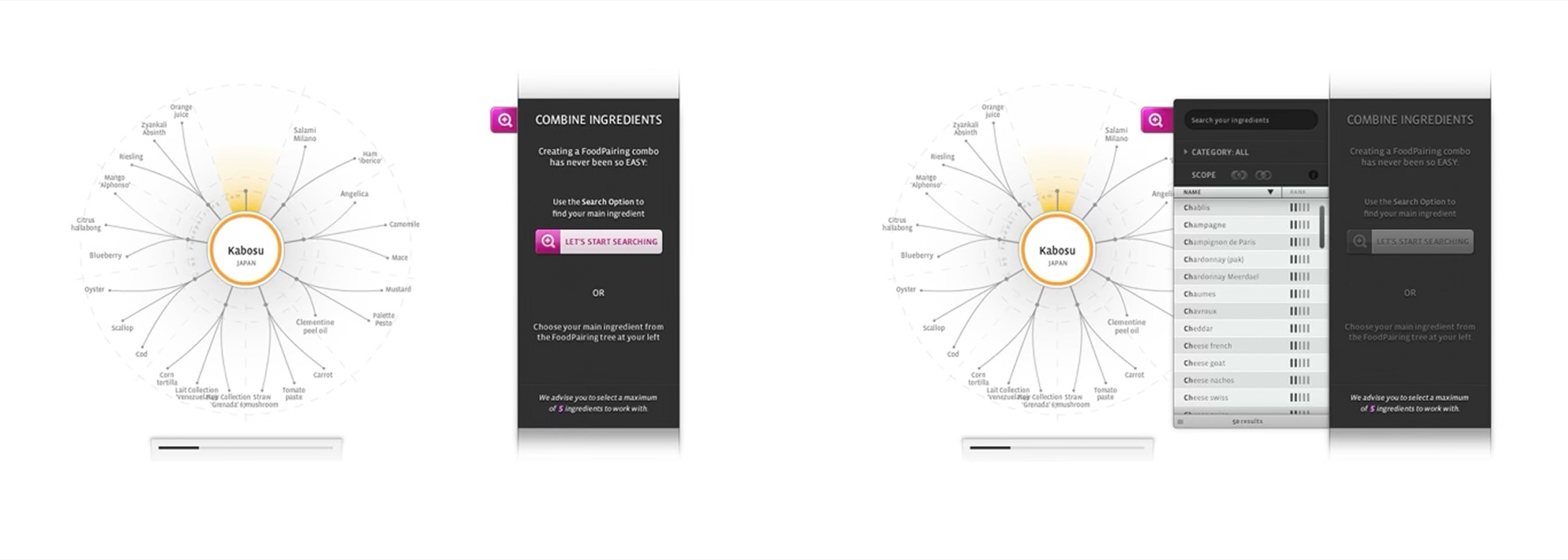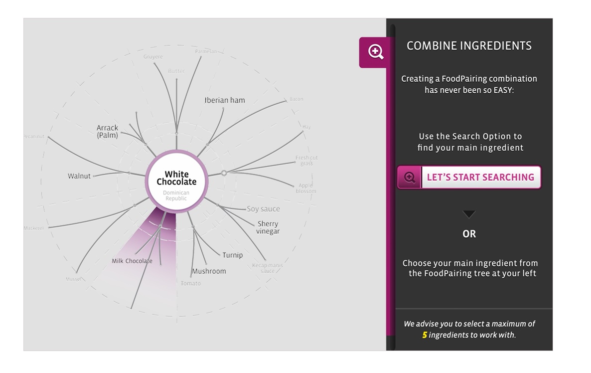 Design the complex food taste combinations in an interactive, visual way so that it feels informative, functional and playful to create new combinations from ingredients for food and drinks through science.
